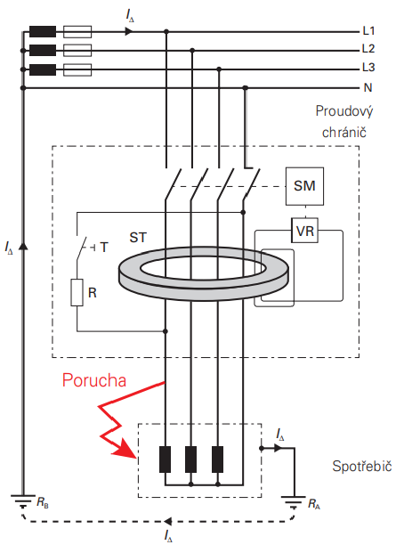 Pokud ale dojde k poruše, například narušením izolace nebo dotykem osoby s živou částí, část proudu začne unikat mimo pracovní obvod, typicky do země (zemní poruchový proud). V takovém případě je rovnováha proudů narušena a rozdíl mezi proudem, který do obvodu vtéká a který se vrací, je nenulový. Tento rozdíl se nazývá reziduální proud. V součtovém transformátoru se vlivem této nerovnováhy vytvoří magnetický tok, který indukuje napětí v pomocné cívce. Toto napětí aktivuje magnetické relé, které okamžitě mechanicky uvolní vypínací mechanismus a rozpojí obvod.